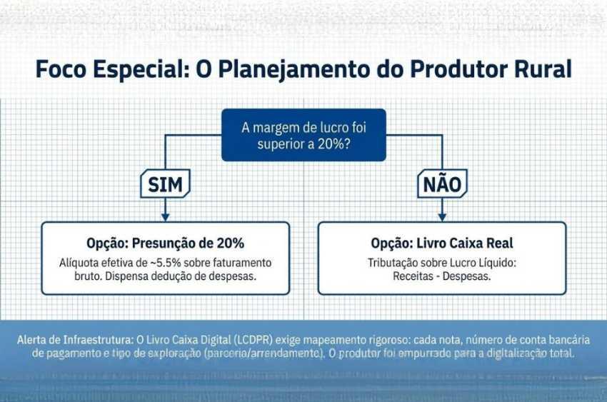 A tributação pode ocorrer pelo Livro Caixa (resultado real) ou pela Presunção (onde 20% da receita bruta é tributada). Para faturamentos acima de R$ 4,8 milhões, o Livro Caixa Digital (LCDPR) é obrigatório, exigindo o detalhamento até da conta bancária utilizada em cada operação.