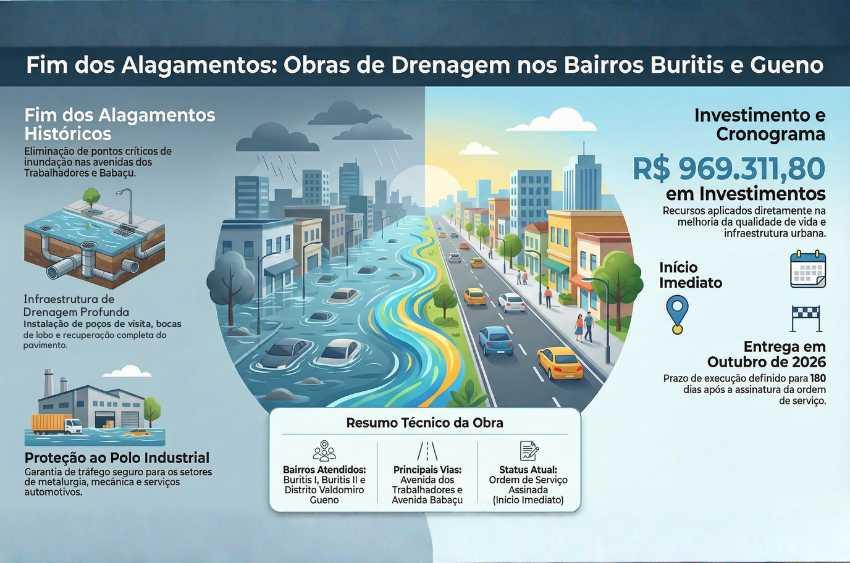 O prazo estipulado para a conclusão dos trabalhos é de 180 dias a partir da assinatura da ordem de serviço. Com o cronograma em dia, a expectativa da administração municipal é que a entrega oficial ocorra ainda em outubro de 2026, garantindo que a população dos bairros Buritis e os trabalhadores do Distrito Gueno enfrentem o próximo período de chuvas com muito mais segurança e mobilidade.
